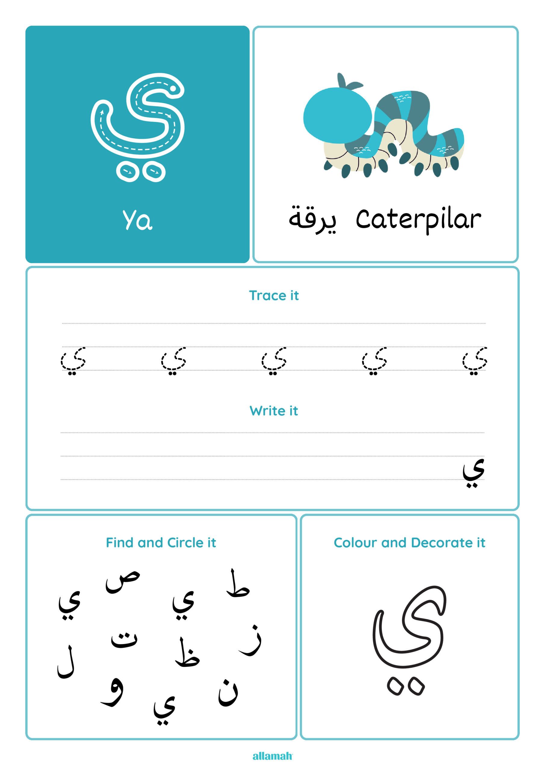 The final letter, Ya (ي), is linked with the caterpillar. Tracing, writing and colouring allow children to celebrate completing the alphabet while learning a new word.