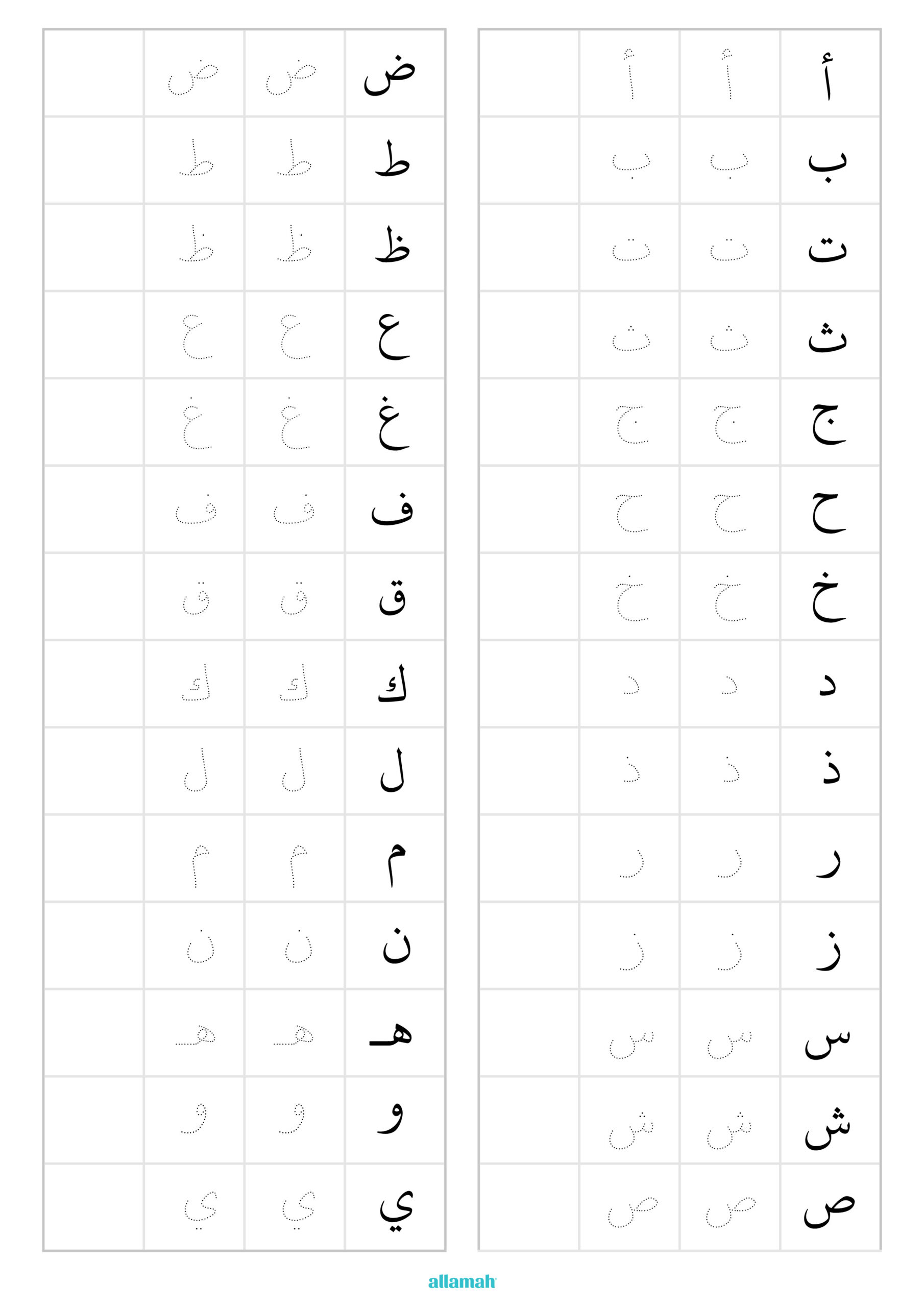 Tracing sheets where children practise writing Arabic letters repeatedly. Supports hand–eye coordination and develops familiarity with correct letter strokes. Useful for strengthening Qur’anic and Arabic literacy skills.