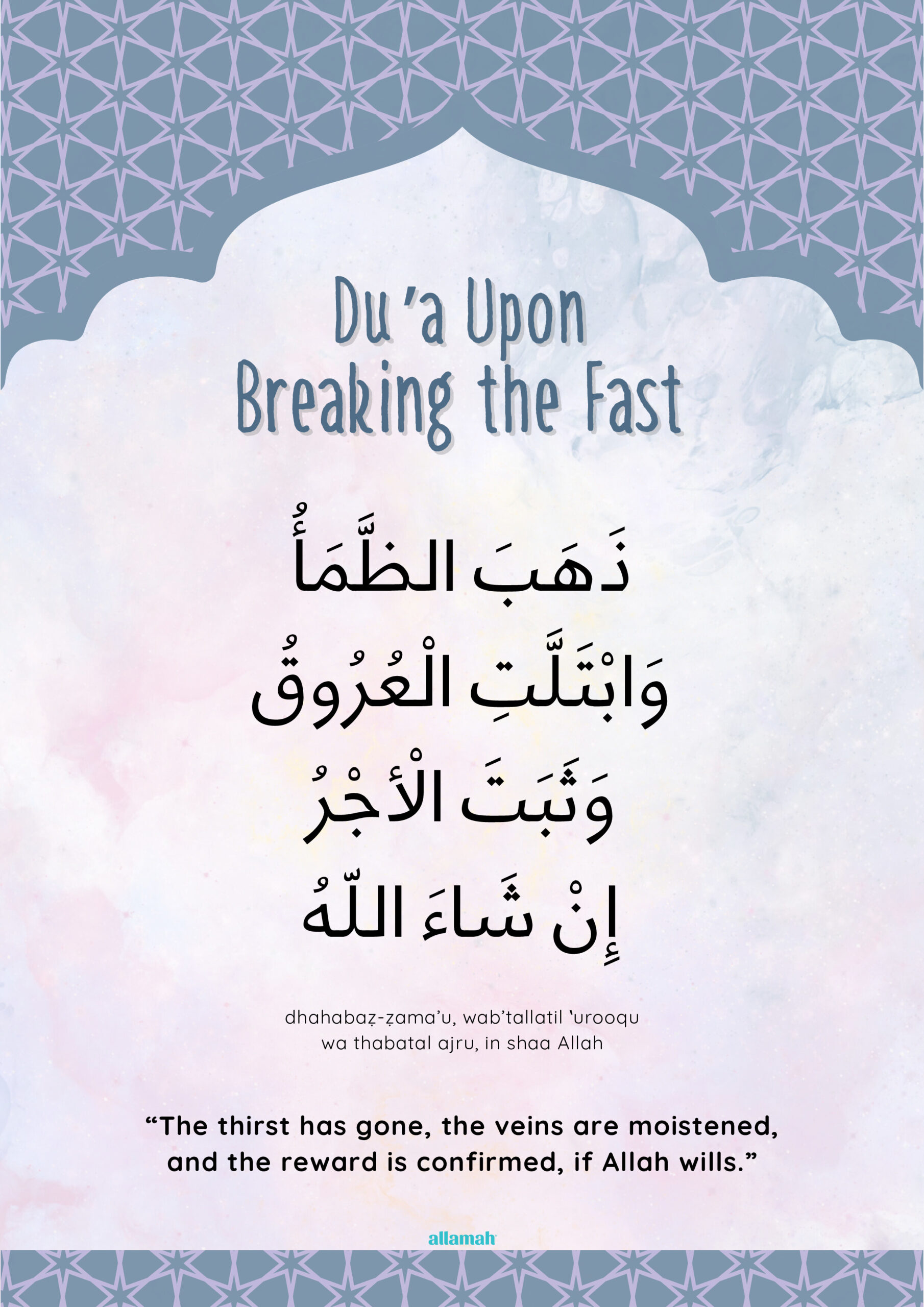 A poster of the authentic supplication for breaking the fast, helping children memorise and practise it daily in Ramadan. Encourages gratitude to Allah and following the Sunnah of the Prophet ﷺ.