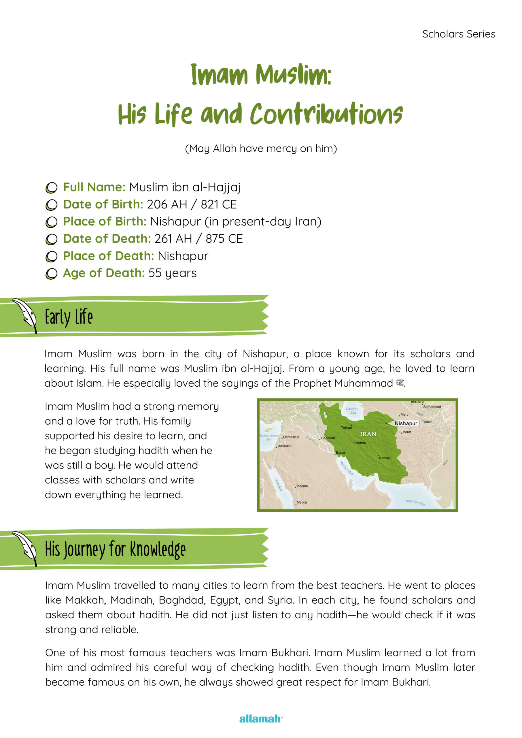 Outlines his role as the compiler of Sahih Muslim, one of the most authentic hadith collections. Demonstrates the value of precision, honesty and reliance on strong narrations, guiding children to appreciate truthfulness and authenticity.
