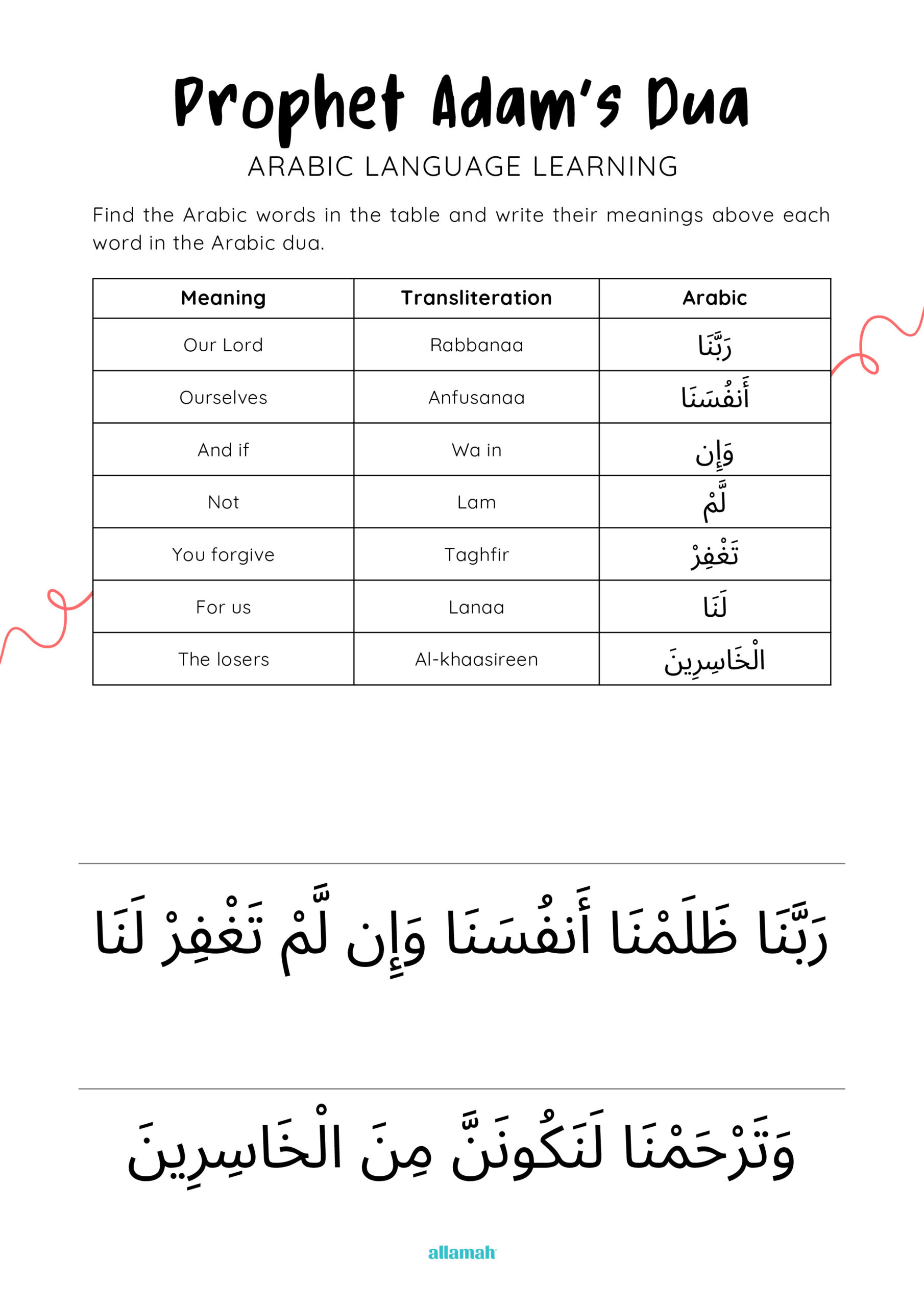 A vocabulary activity based on Prophet Adam’s عليه السلام du‘a, helping children learn key Arabic words such as forgiveness, mercy and mistake. Through this exercise they explore the meaning of repentance and understand how Prophet Adam عليه السلام turned to Allah with humility and hope, strengthening both their language skills and spiritual reflection.