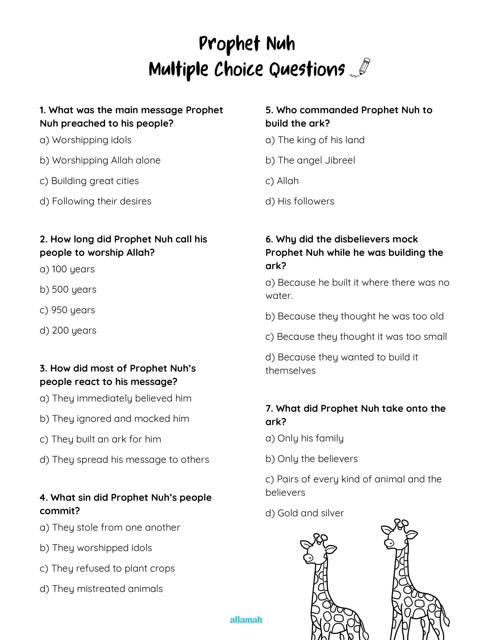 This worksheet uses MCQs to test children on key details of Prophet Nuh’s story. It covers his 950 years of preaching, the people’s idolatry, the ark, the flood and Allah’s promise afterwards. It builds comprehension and reinforces patience, trust in Allah and obedience to His commands.