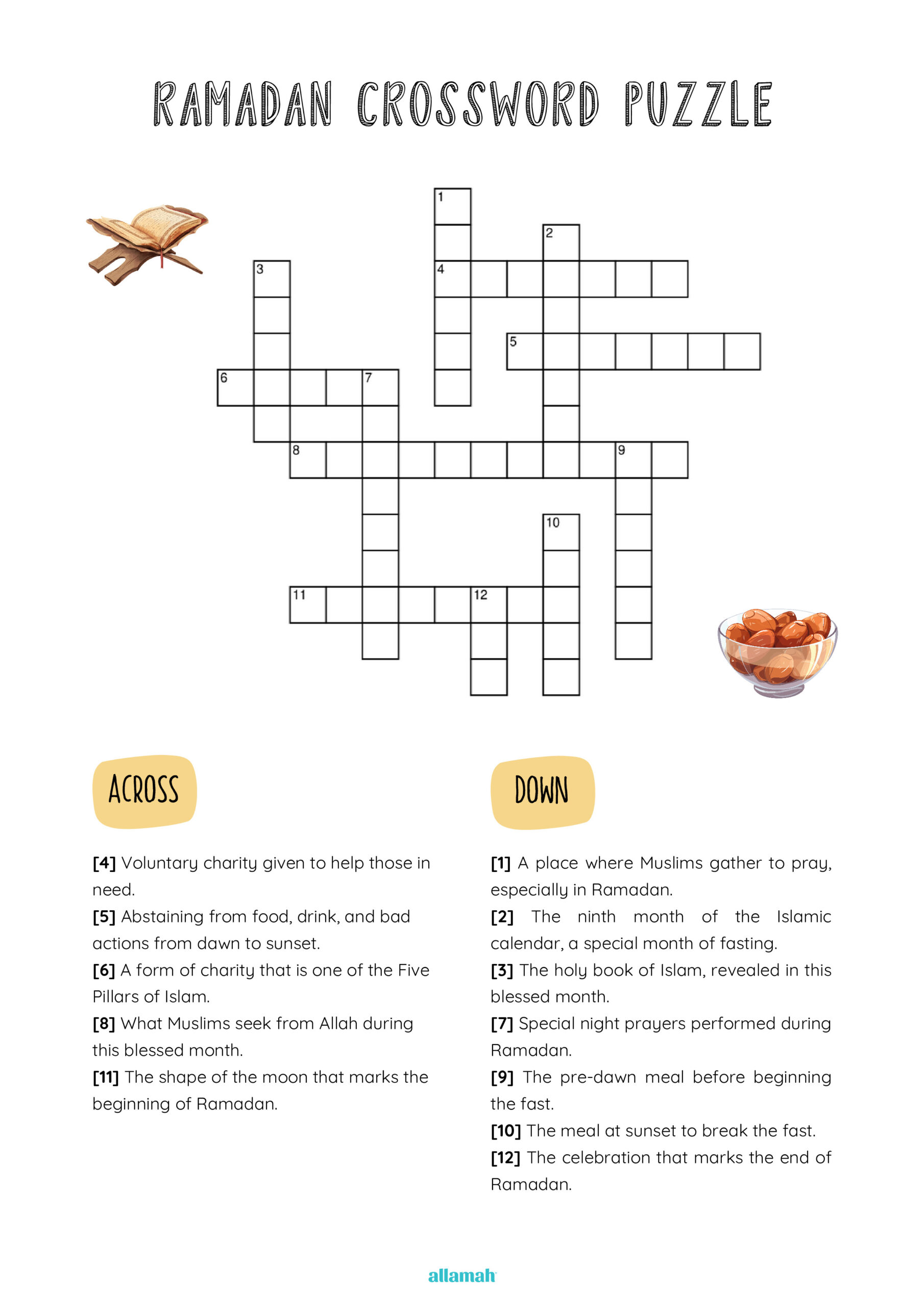 This crossword uses clues from Ramadan life and Qur’anic lessons to help children recall and apply their knowledge. It is interactive and thoughtful, teaching Islamic terms while building problem-solving and critical thinking skills.