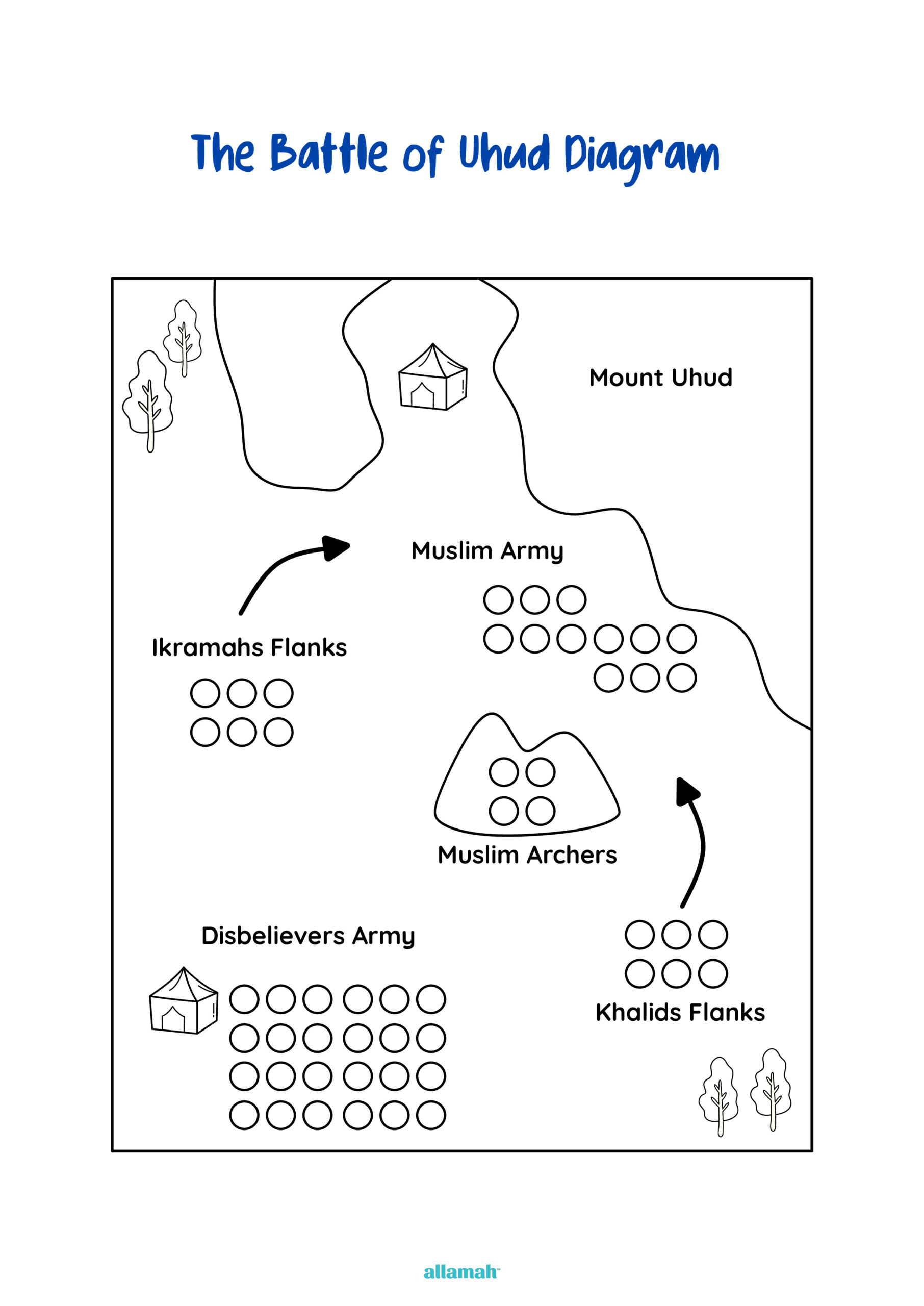 A visual map of Uhud with Mount Uhud, Muslim archers, the main armies and flanking movements of Khalid ibn al-Walid and Ikrimah. It illustrates how disobedience of archers led to setback, teaching obedience, discipline and lessons in resilience.