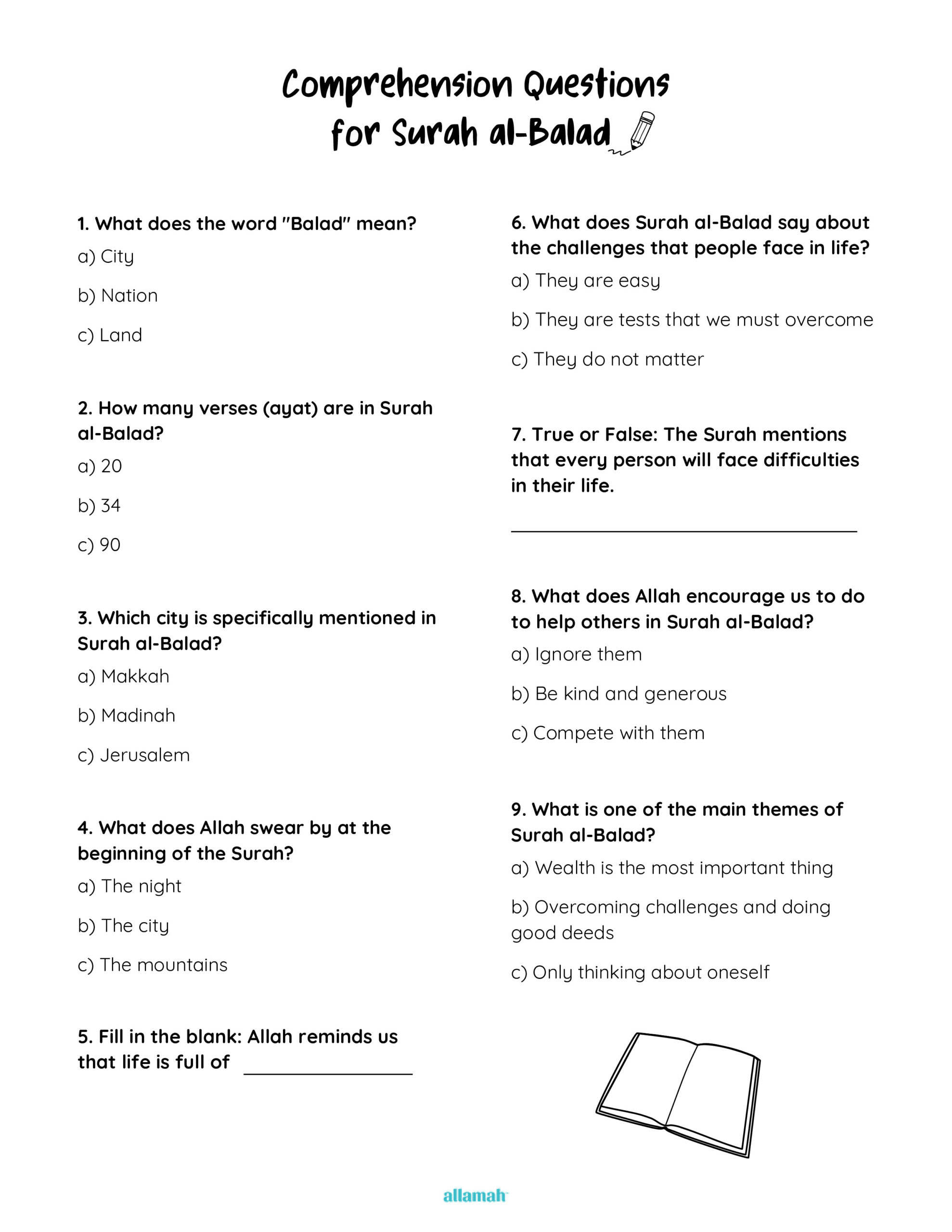 Surah Al-Balad teaches that life is full of difficulties, but true success is in patience, generosity and helping others. Children learn that the Qur’an mentions Makkah and encourages kindness to the needy. The worksheet builds resilience, compassion and understanding that trials are tests.