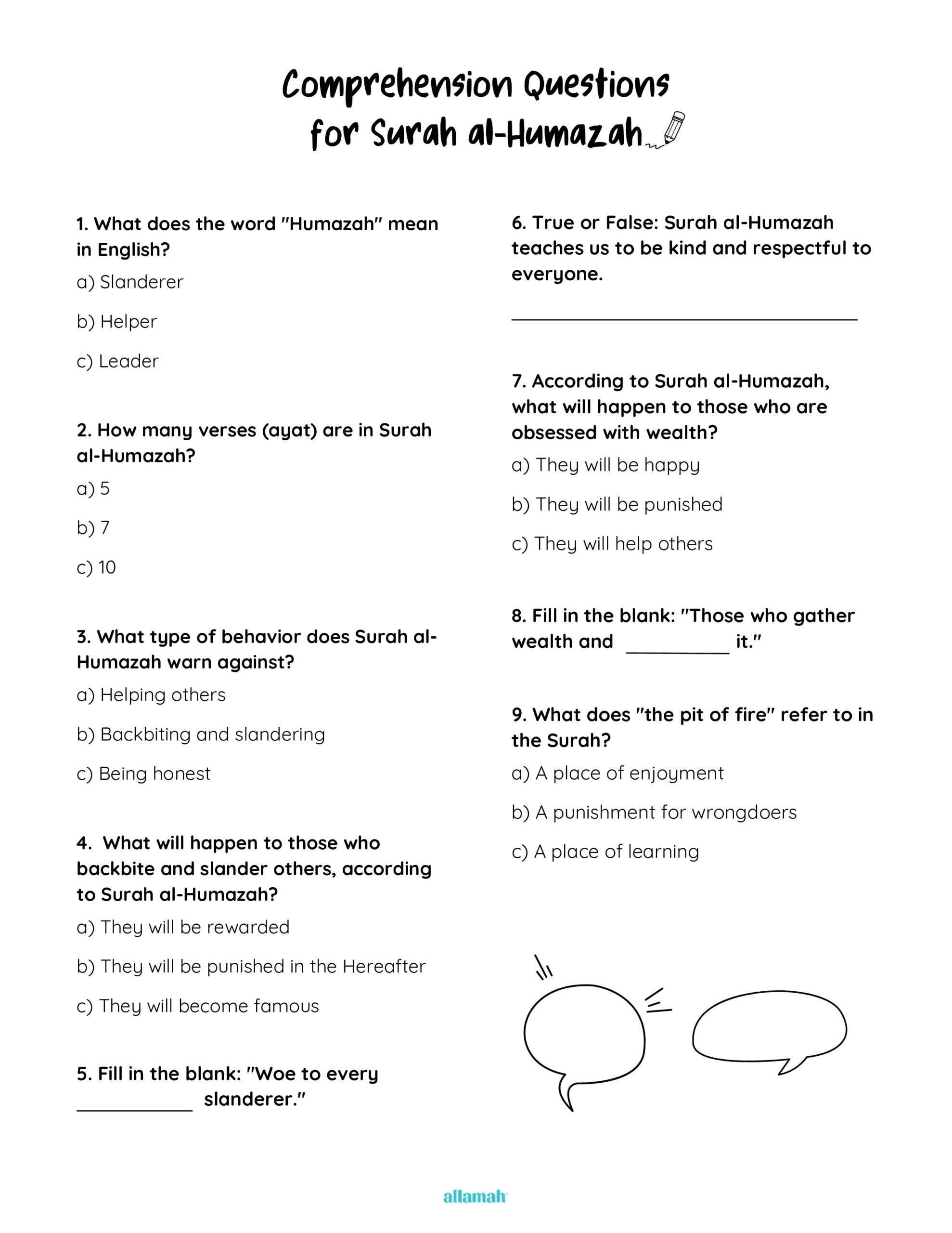 This worksheet warns against backbiting, slander and greed for wealth. Children learn that such behaviour leads to punishment in the Hereafter and that wealth cannot save a person. It encourages kindness, respect, positive speech and using blessings for good.
