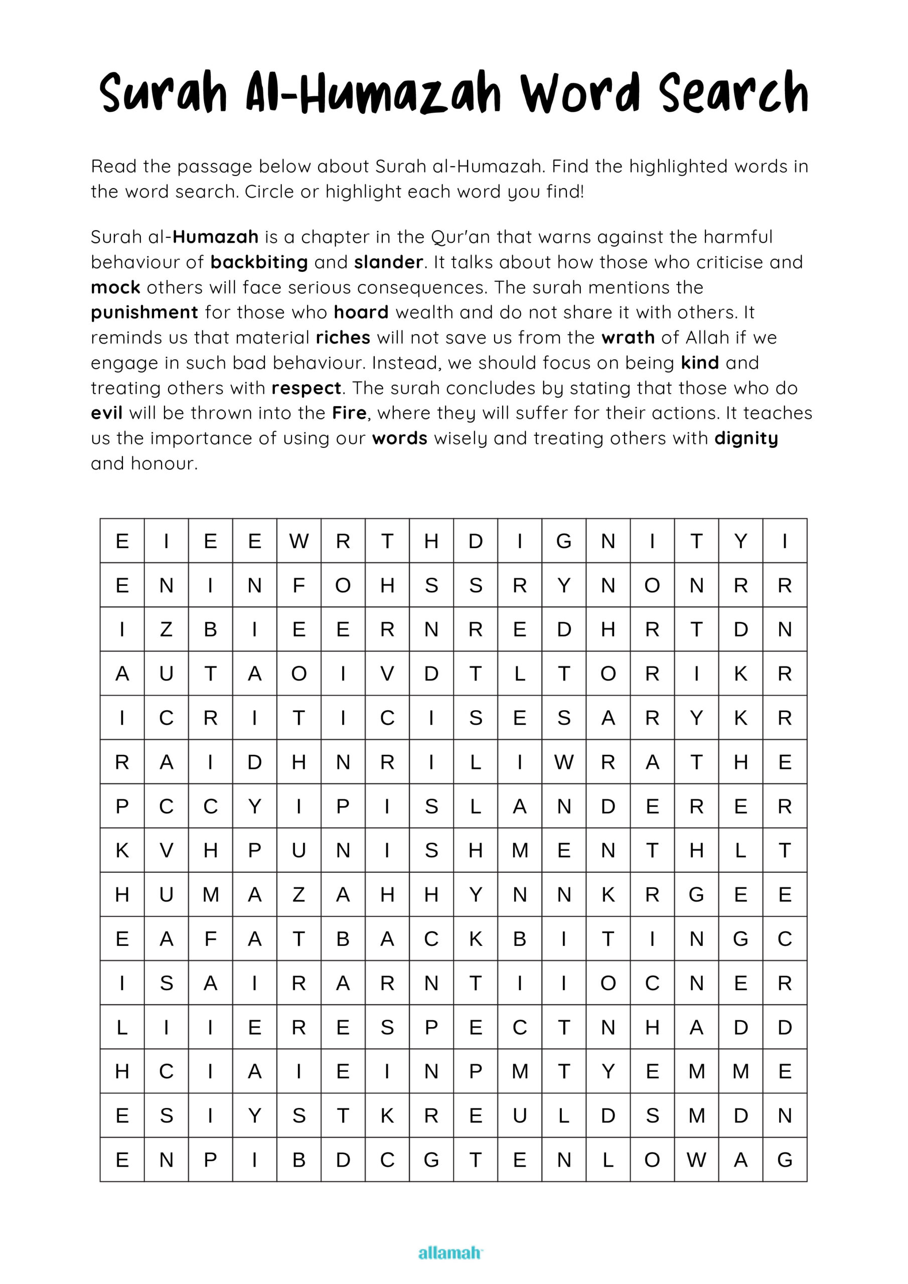 This Surah warns against backbiting, slander and greed. It reminds children that wealth will not save a person from Allah’s punishment. The worksheet promotes kindness, dignity and good use of words.