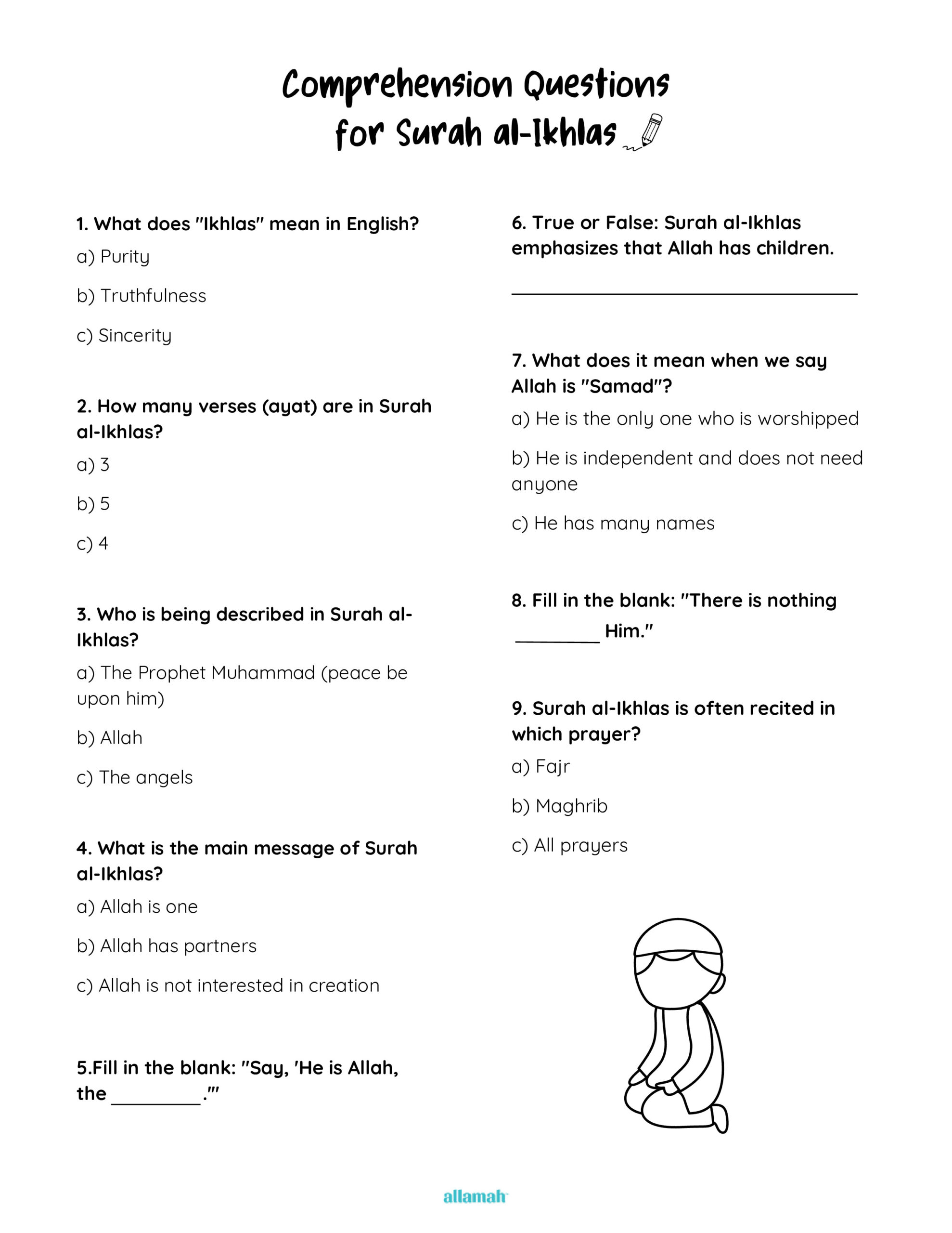 This activity introduces children to the core of Tawhid, Allah’s oneness. They learn that Allah is unique, eternal and has no children, partners or equal. The worksheet encourages sincerity in worship, reciting Surah al-Ikhlas in prayer and understanding that this Surah summarises the essence of Islam.
