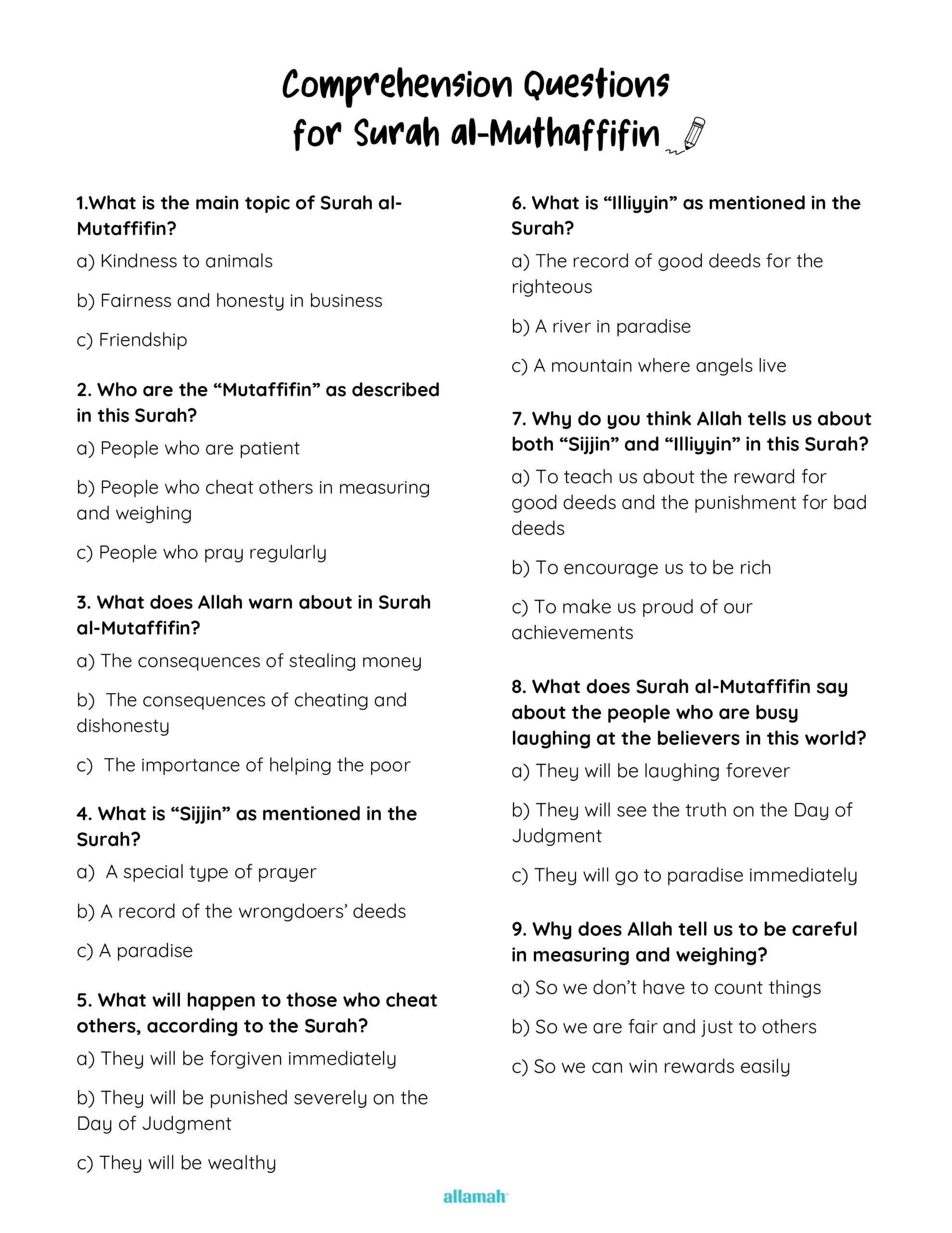 This lesson focuses on honesty in trade and fairness in dealings. Questions explain the meaning of Sijjin and Illiyyin, the records of the wicked and righteous. Children learn that cheaters will face punishment while the faithful will enjoy rewards in Paradise. It develops values of fairness, justice and awareness that every action is recorded by Allah.