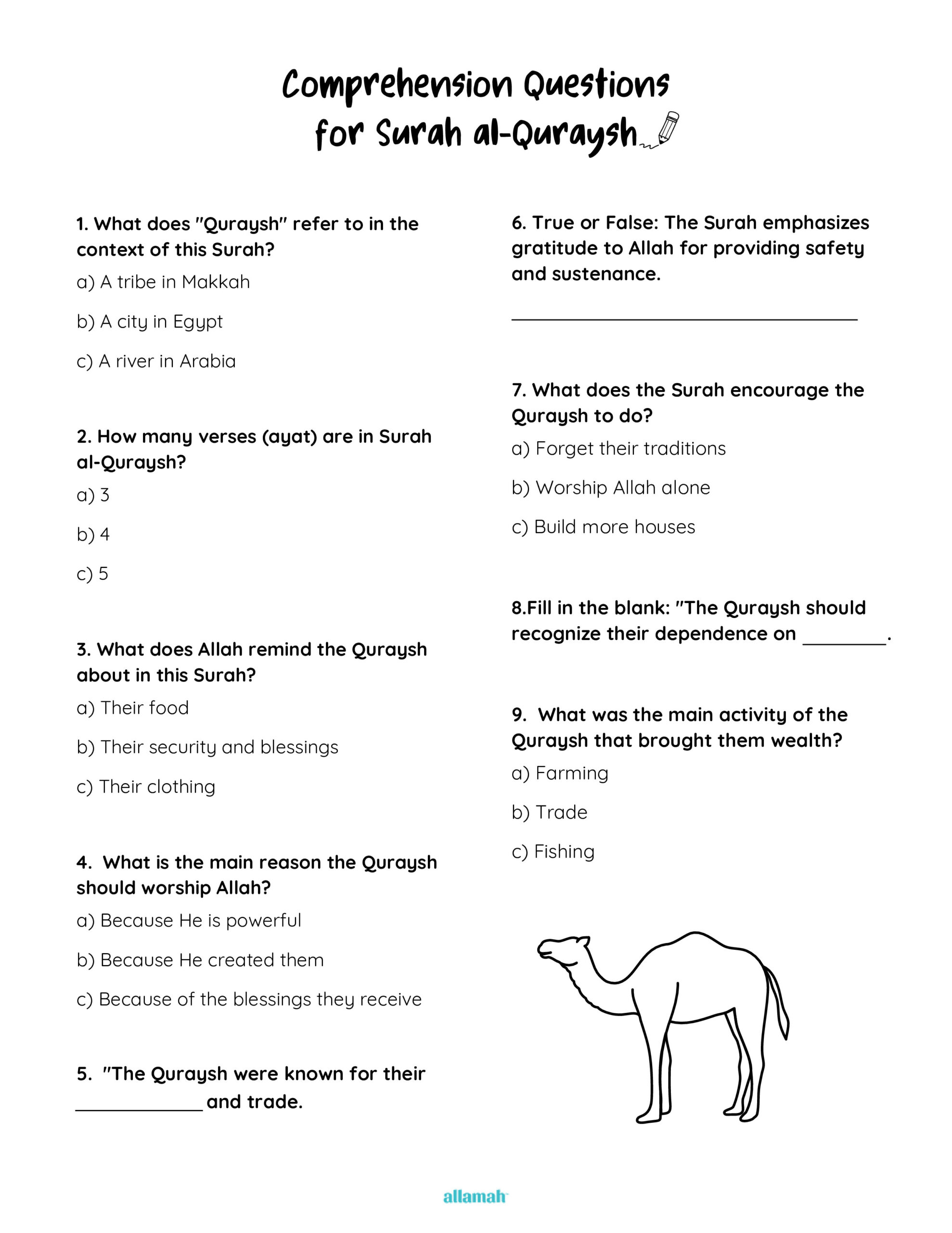 This activity highlights Allah’s blessings on the Quraysh, including safety, provision and successful trade. It encourages gratitude and worship of Allah alone, reminding children that security and provision come only from Him. It helps instil thankfulness and trust in Allah for daily needs.