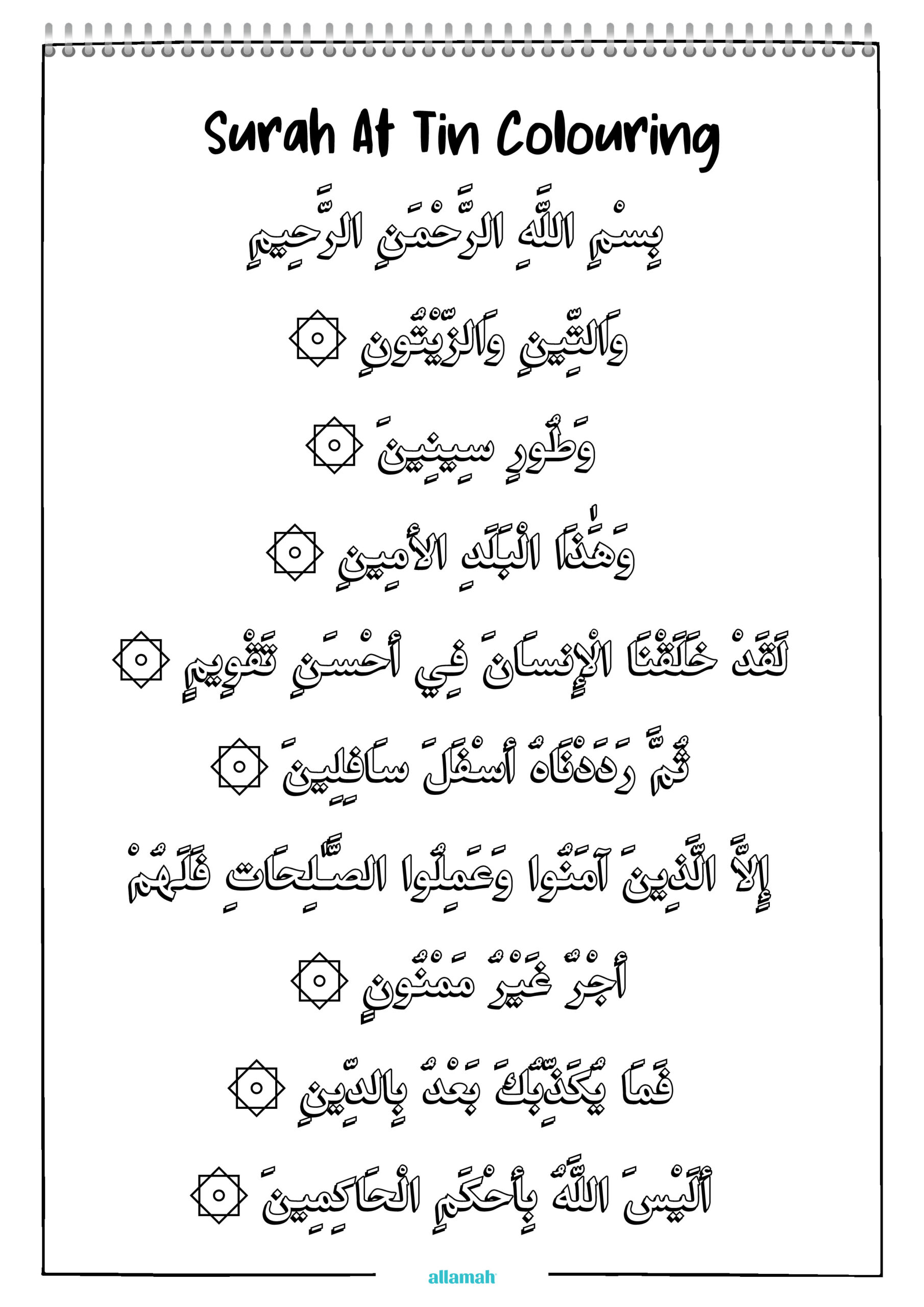 Colouring sheet of Surah At Tin, teaching Allah’s perfect creation of mankind, the value of good deeds and accountability. Encourages children to reflect on Allah as the best of judges.
