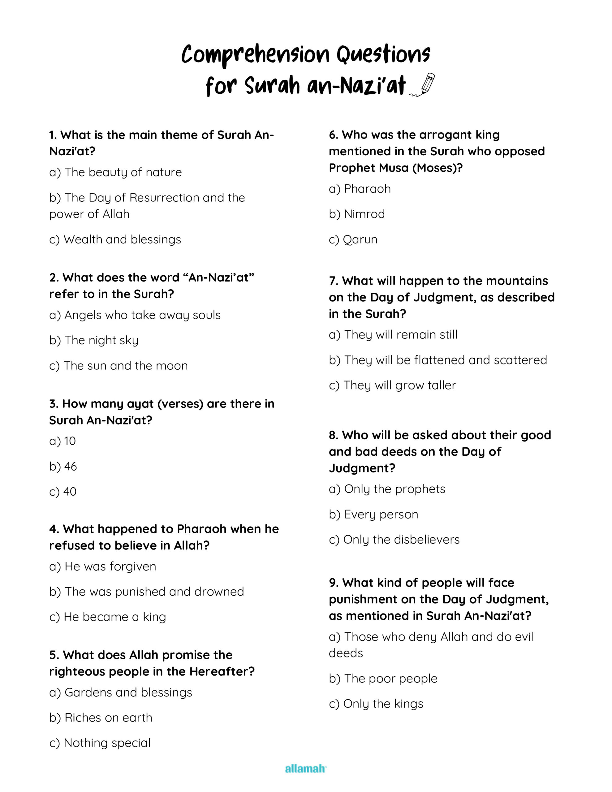 This lesson focuses on resurrection and the power of Allah. Children learn about angels taking souls, Pharaoh’s arrogance and destruction and Allah’s signs in creation. It highlights that every person will be judged, the righteous will have Paradise and the wicked will face punishment. It encourages humility, belief in the Hereafter and preparation through good deeds.