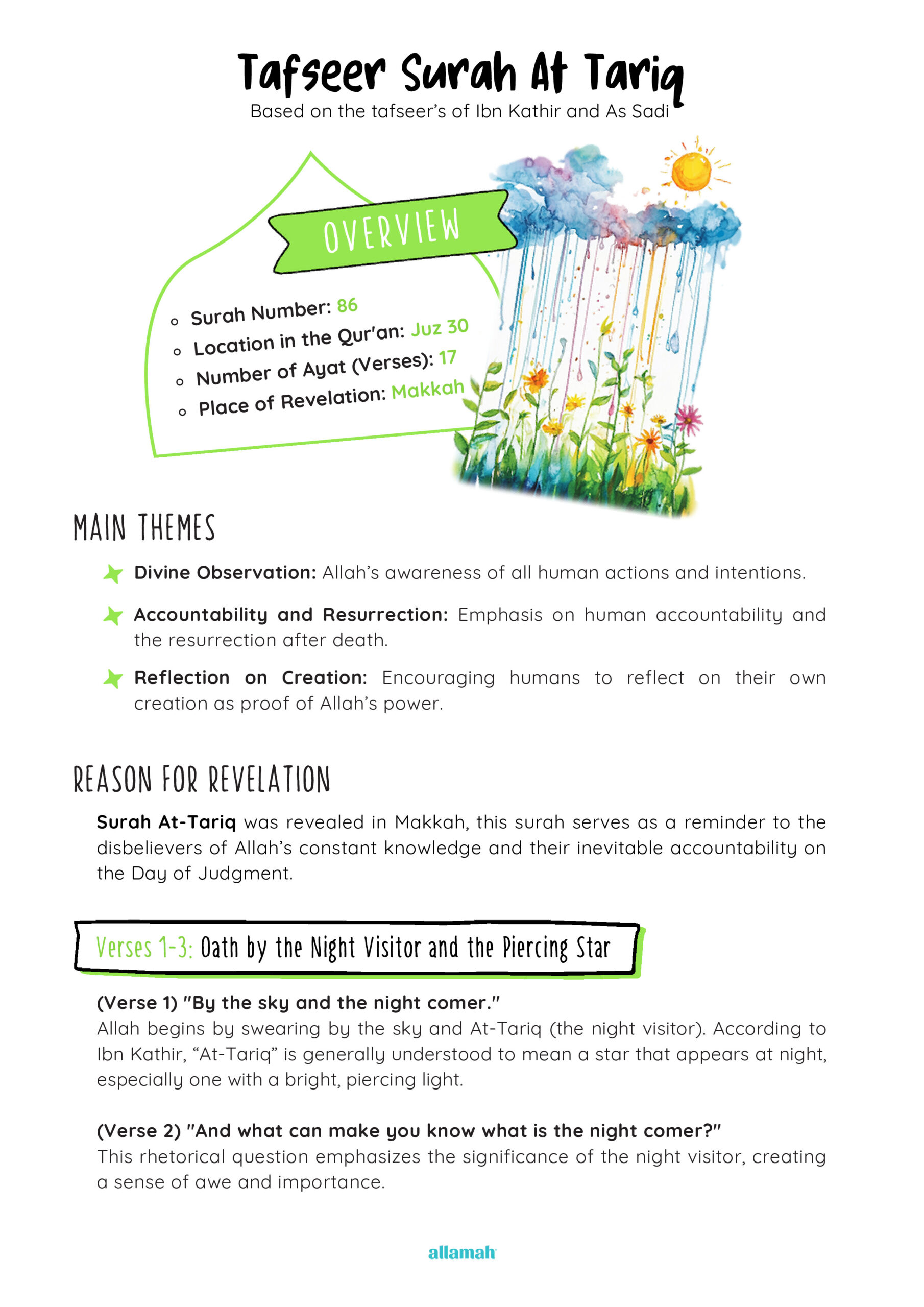Focusing on the night star, this surah reminds us of Allah’s power in creation and His knowledge of all matters. The worksheet encourages children to reflect on Allah’s signs in nature and understand resurrection. It teaches trust in Allah’s protection and awareness that no secret is hidden from Him .