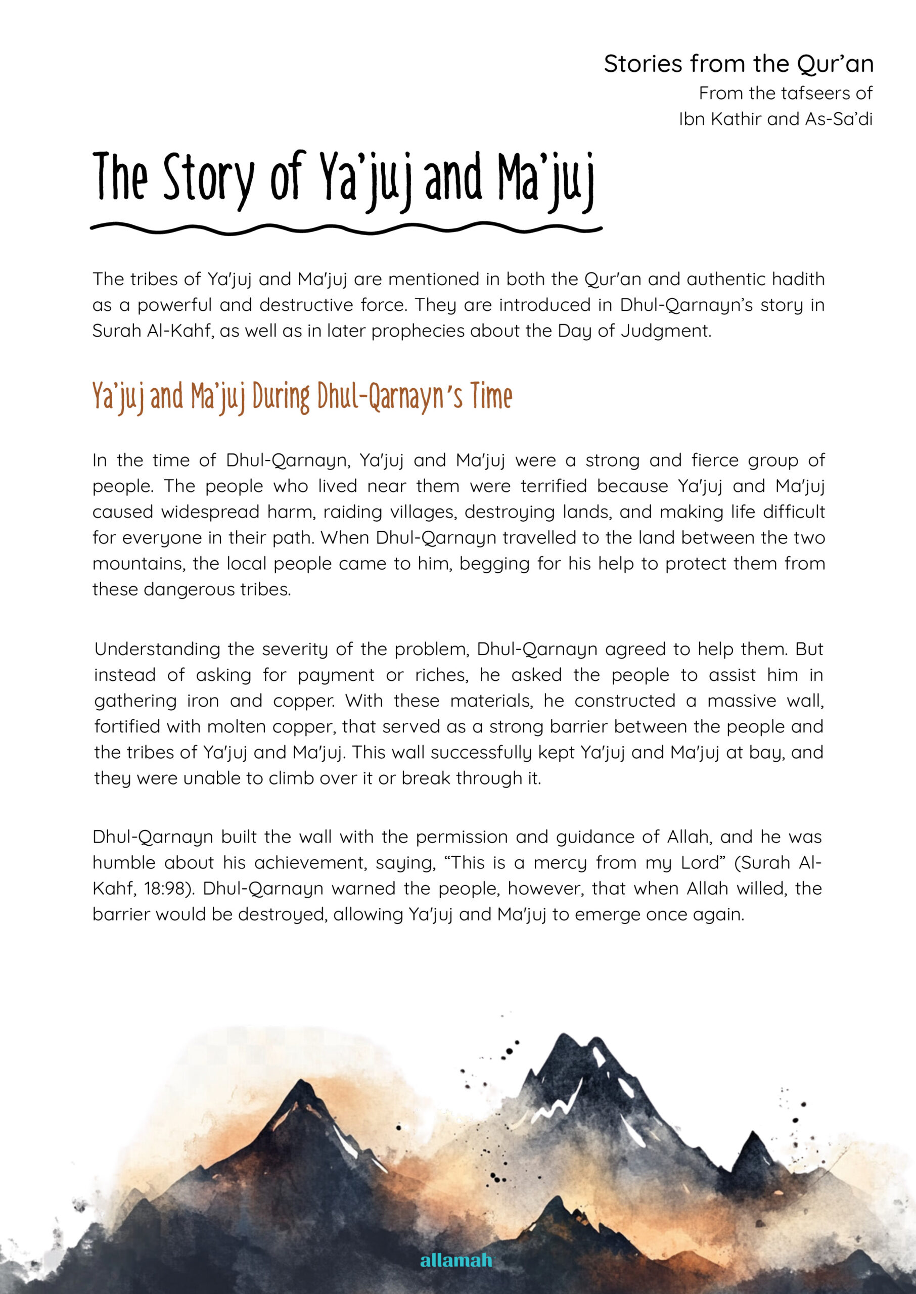 This worksheet explains Dhul-Qarnayn’s building of a barrier to protect people from the destructive tribes. It links to Surah Al-Kahf and hadith about their return near the Day of Judgement. Children learn about leadership, humility and trusting Allah’s ultimate control over events.