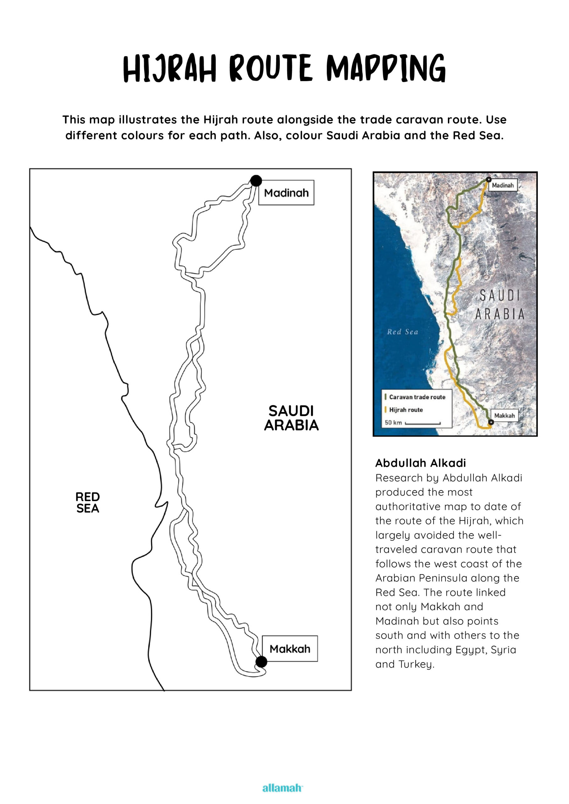 Map activity showing the Prophet’s ﷺ migration route from Makkah to Madinah. Children colour the Hijrah path and compare it with caravan trade routes. Teaches the importance of the Hijrah in establishing Islam and the wisdom in avoiding well-known paths.