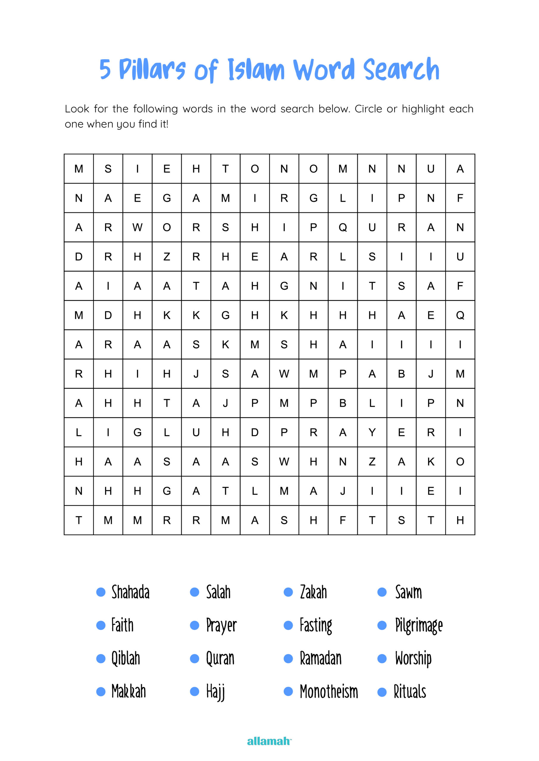 This activity includes key terms like Shahadah, Salah, Zakah, Sawm, Hajj, Qur’an and Ramadan. It builds vocabulary and reinforces concepts while making learning enjoyable. It helps children memorise the essentials of Islamic practice.