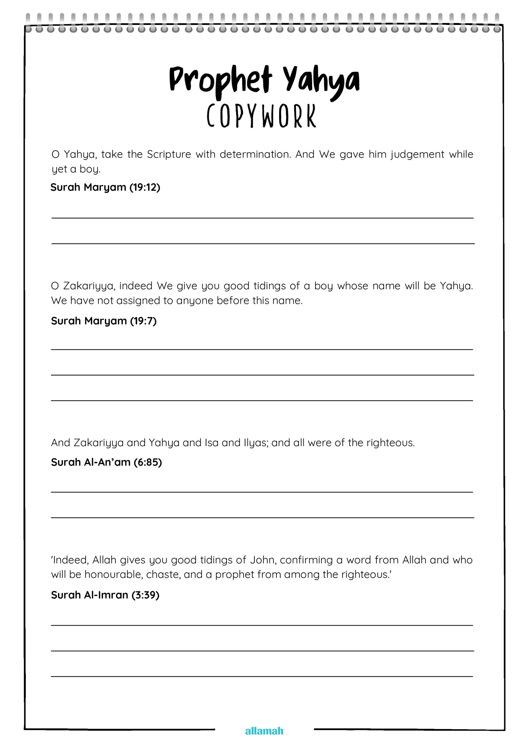 Children copy verses from the Qur’an about Prophet Yahya. The passages highlight his righteousness, honour, chastity and early wisdom. It teaches determination in holding the Scripture, encouraging children to value purity, obedience and piety.